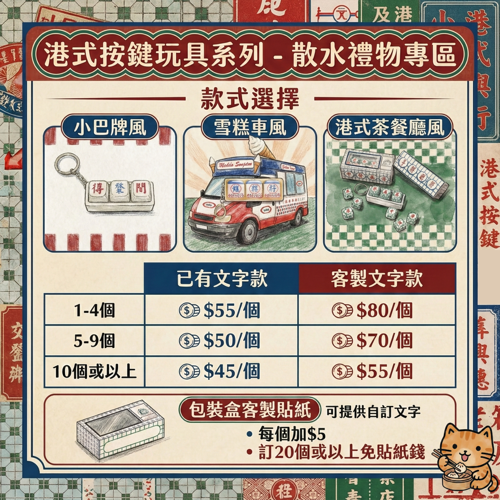 唔想派西餅咁普通?送呢個全公司都記得你!集齊三大港式經典風格,機械軸手感極致治癒。設有「多買多平」階梯式優惠(低至$45/個),訂購滿 20 個更送客製化包裝盒貼紙。最啱做散水禮物、婚禮回禮或公司紀念品。